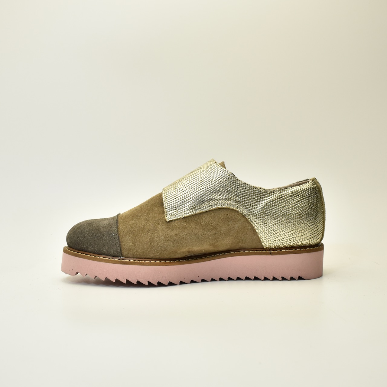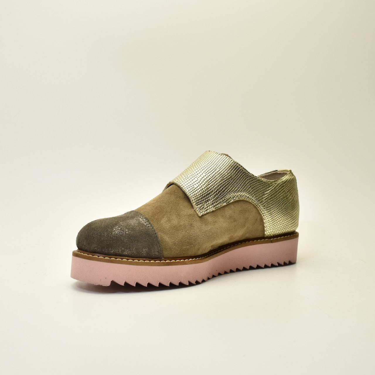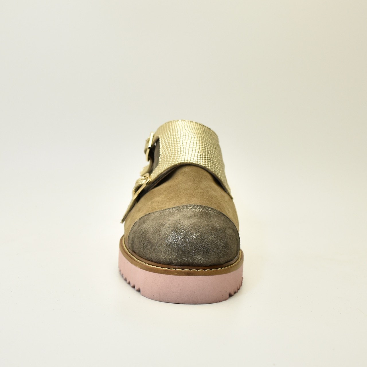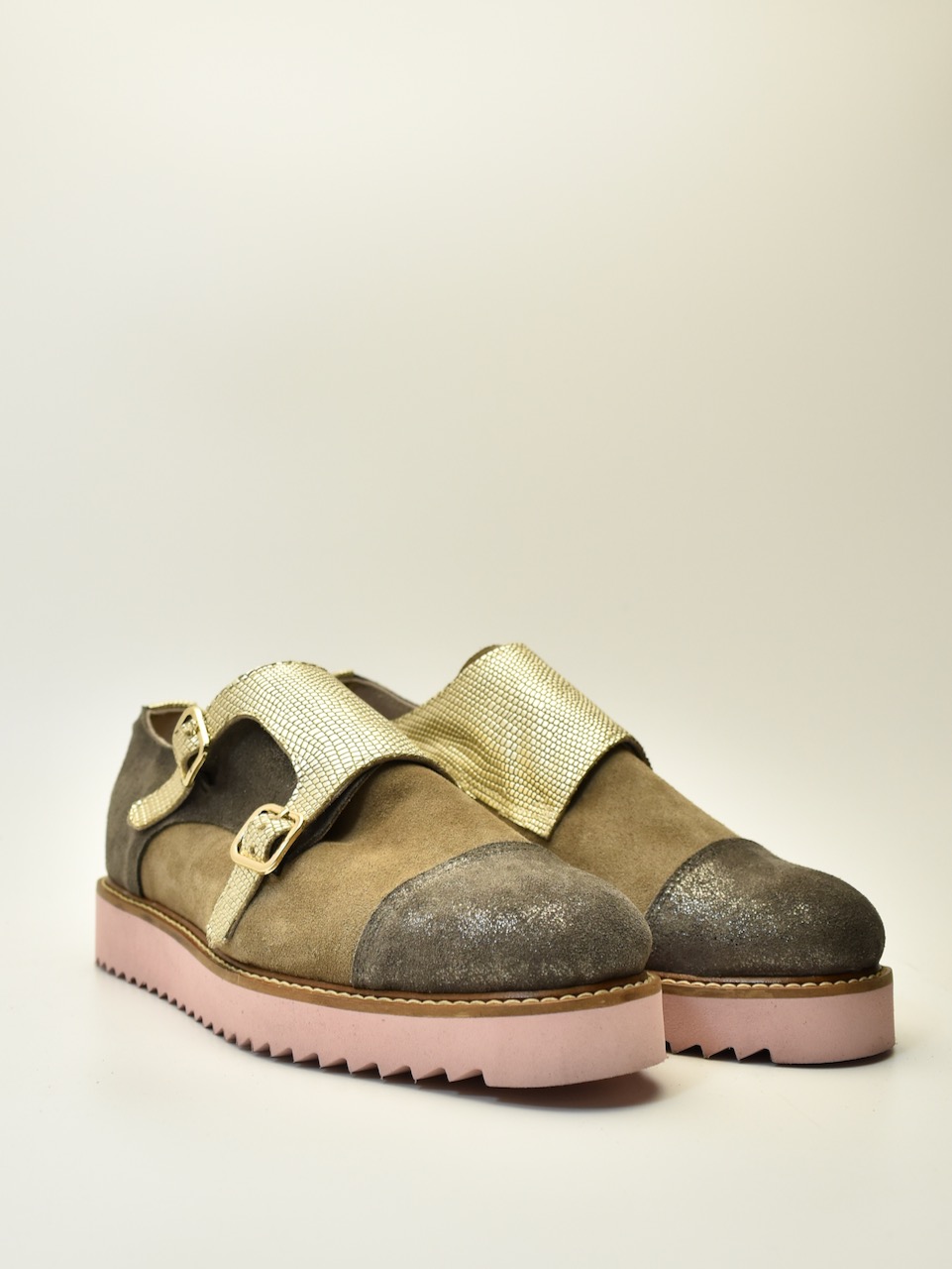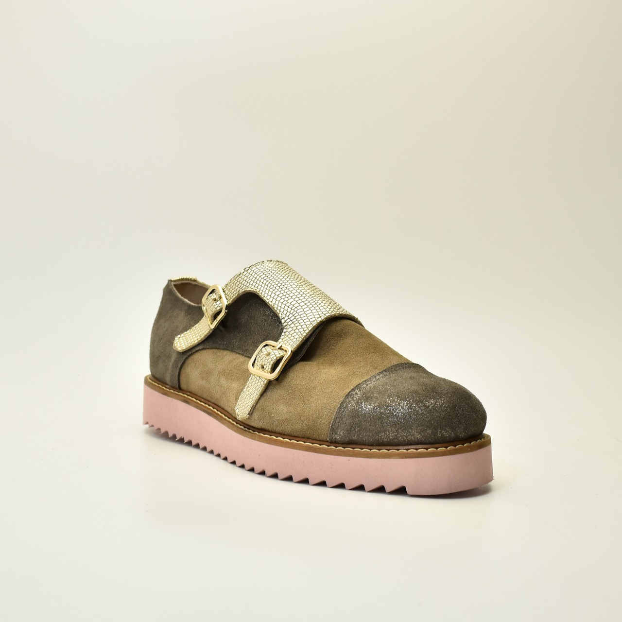 Spoj modernog dizajna i vrhunske izrade. MONKS Golden ručno je izrađen par cipela od visokokvalitetne brušene kože u kombinaciji sa teksturiranim zlatnim kaiševima i upečatljivim roze đonom. Dvostruka kopča daje retro šarm, dok savremeni tonovi i udobna forma osvajaju na prvo nošenje. Idealan izbor za one koji žele da se istaknu stilom – bez kompromisa.