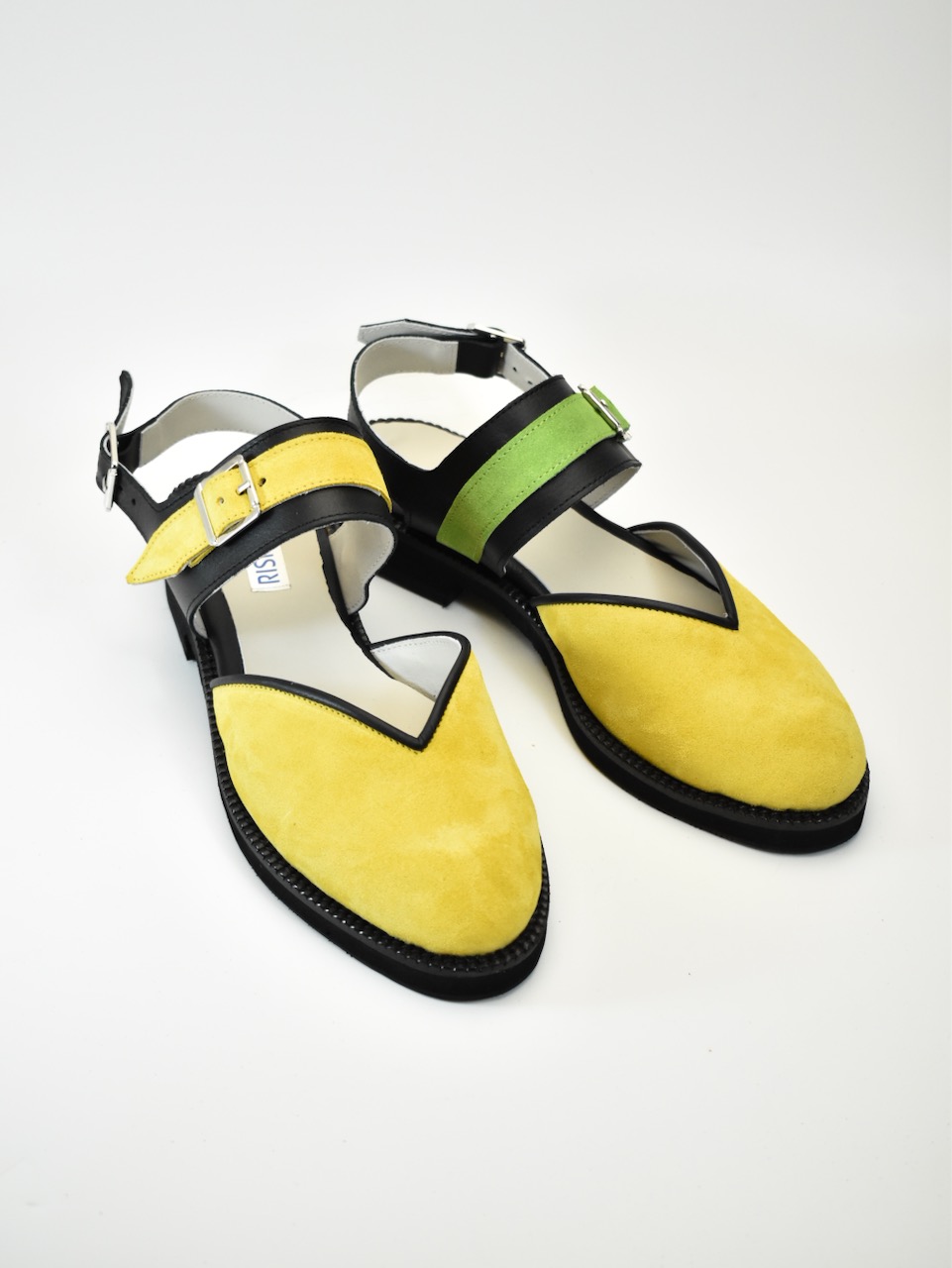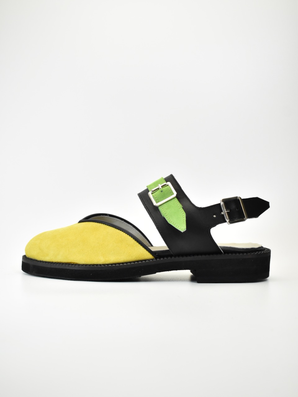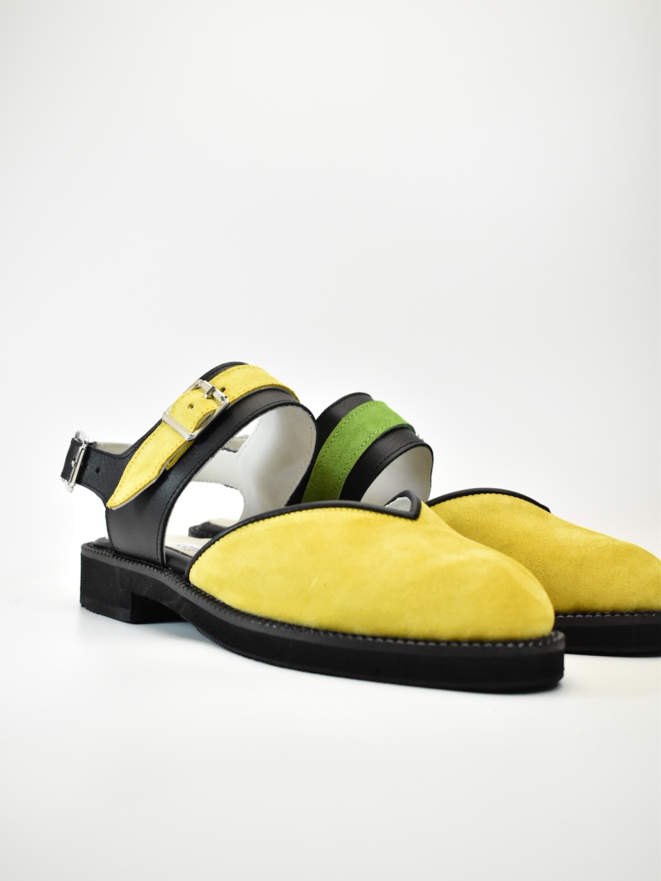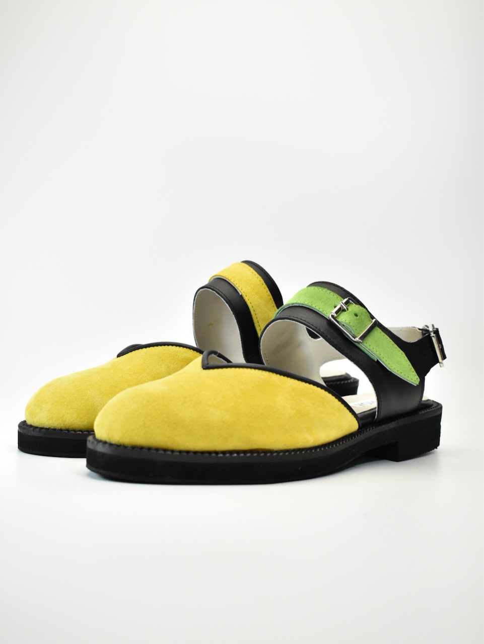 Asimetrični kaiševi u kontrastnim bojama – žutoj i limeta zelenoj – osvežavaju osnovu od jarko žutog velura, dok crni kožni detalji pružaju elegantan okvir. Ručno rađene, ove cipele su stvorene za dinamične korake i neustrašive modne izraze.