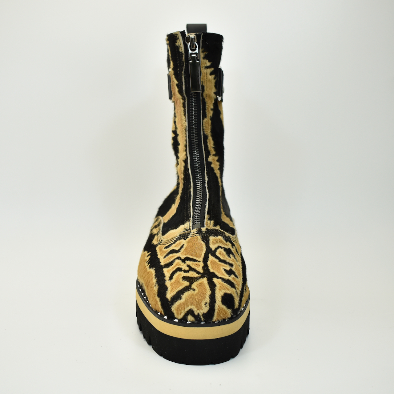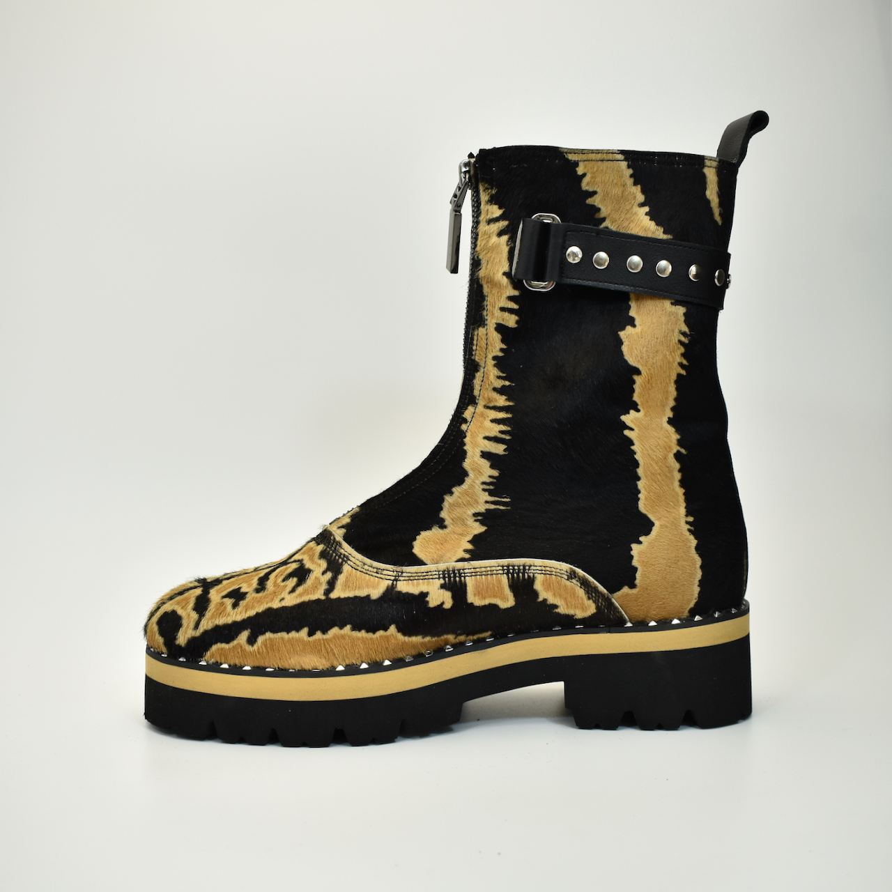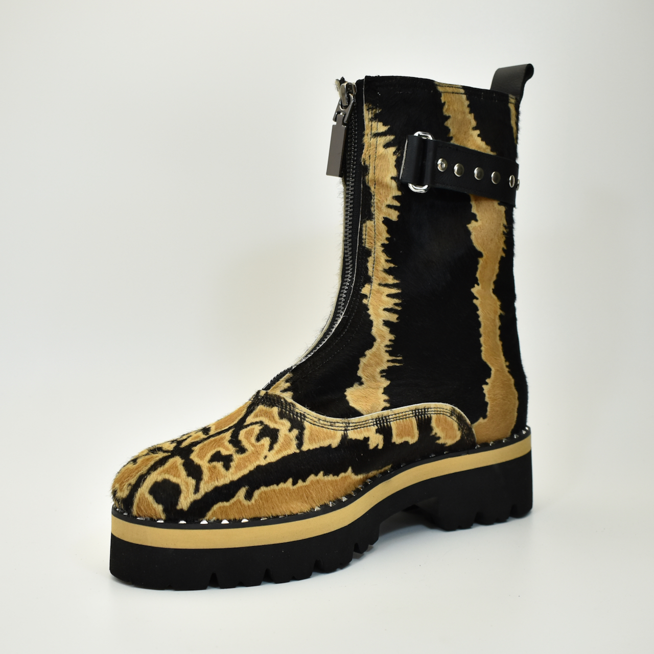 Za one koji znaju da je stil u detaljima i hrabrosti. Ove ekskluzivne čizme izrađene su ručno od visokokvalitetne prirodne “pony” dlake sa upečatljivim dezenom tigrovih šara, čime svaki par postaje unikatno umetničko delo. Model je dodatno naglašen masivnim đonom i zaštitnom zonom sa metalnim nitnama, dok unutrašnjost i akcenti u bež boji kako bi se uklopili sa pričom dlake.