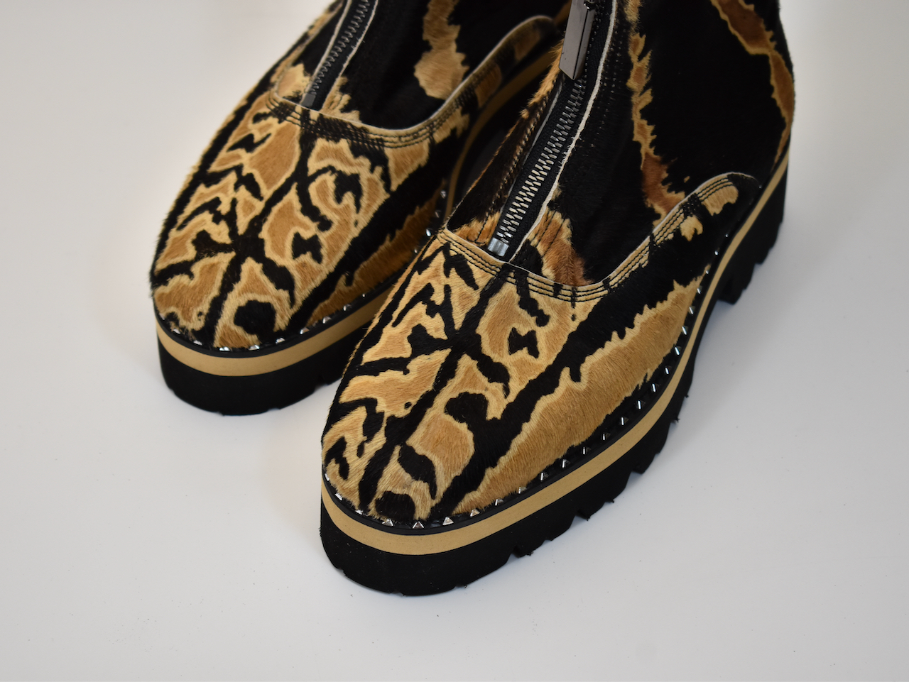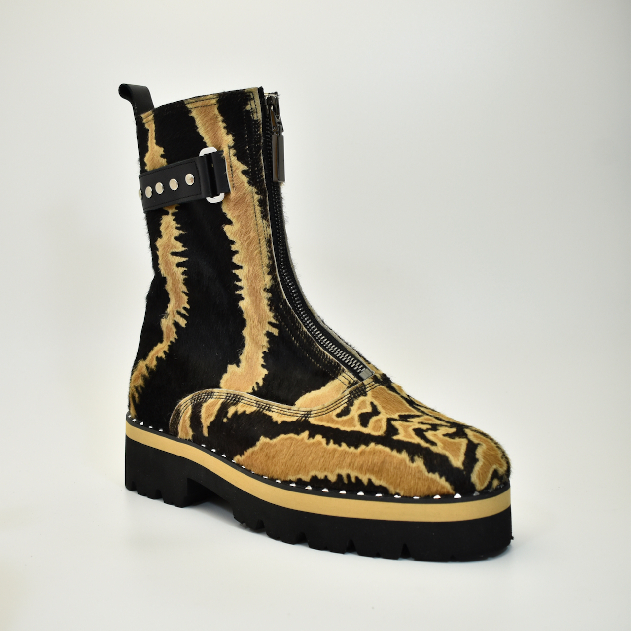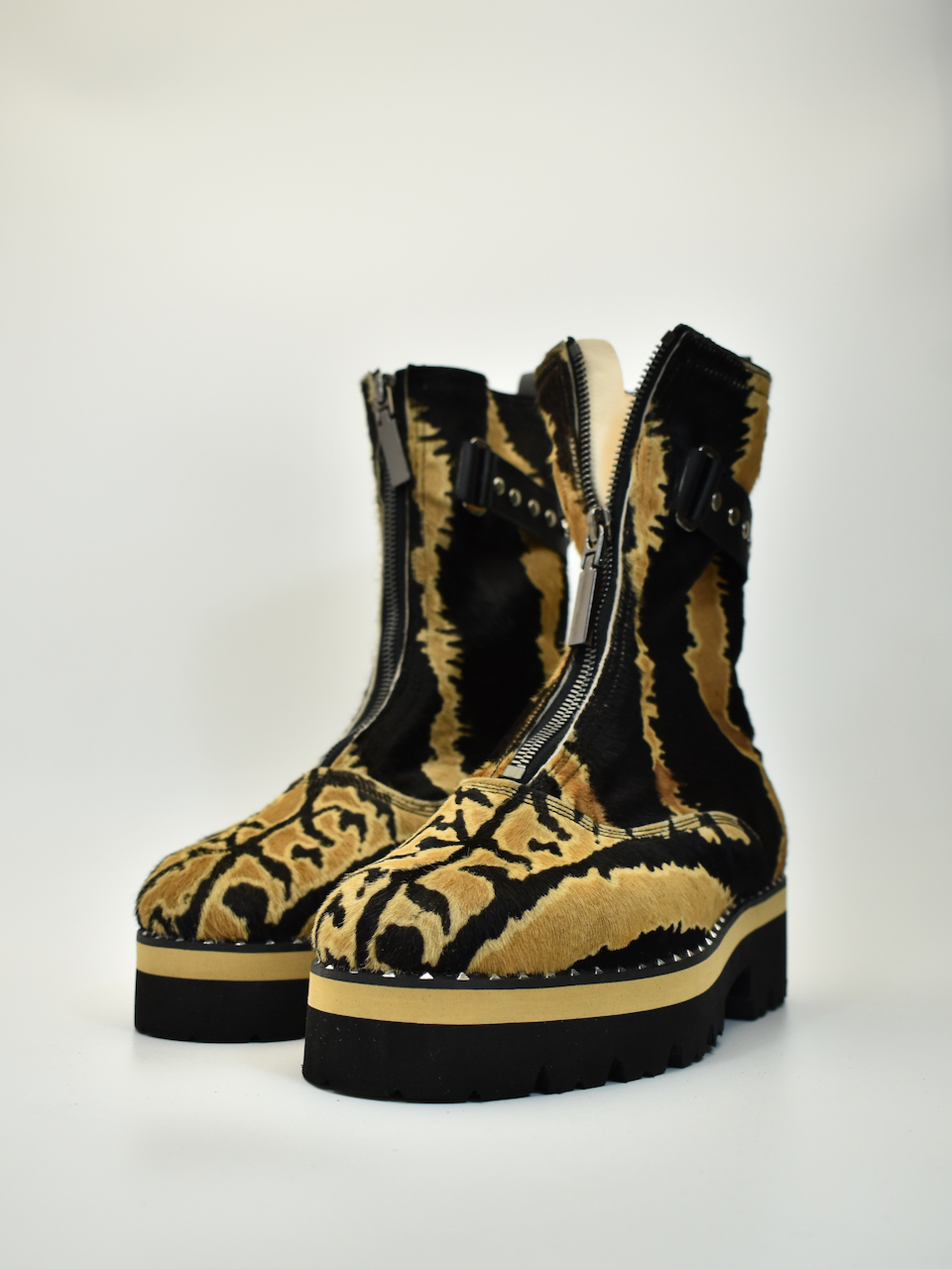 Za one koji znaju da je stil u detaljima i hrabrosti. Ove ekskluzivne čizme izrađene su ručno od visokokvalitetne prirodne “pony” dlake sa upečatljivim dezenom tigrovih šara, čime svaki par postaje unikatno umetničko delo. Model je dodatno naglašen masivnim đonom i zaštitnom zonom sa metalnim nitnama, dok unutrašnjost i akcenti u bež boji kako bi se uklopili sa pričom dlake.